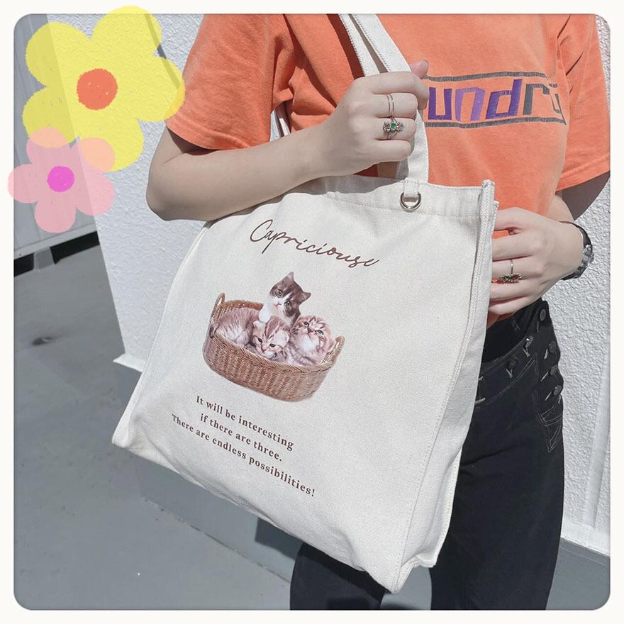 【212816】帆布転写プリントDカン付ネコスクエアトート