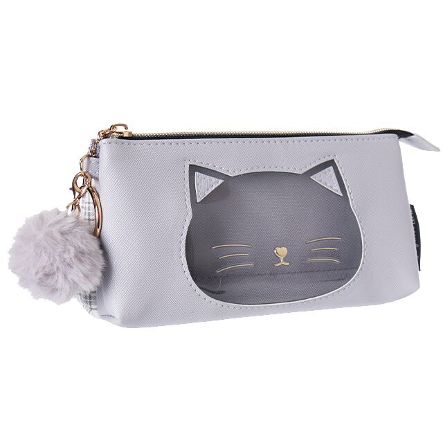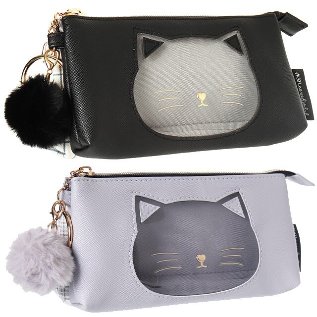 【Z22693】合皮PVCネコフェイス3ポケットペンポーチ